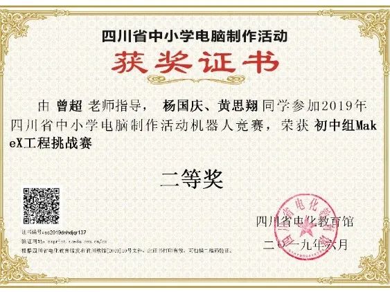 学生获2019年四川省中小学电脑制作活动机器人竞赛省二等奖1项、三等奖2项。